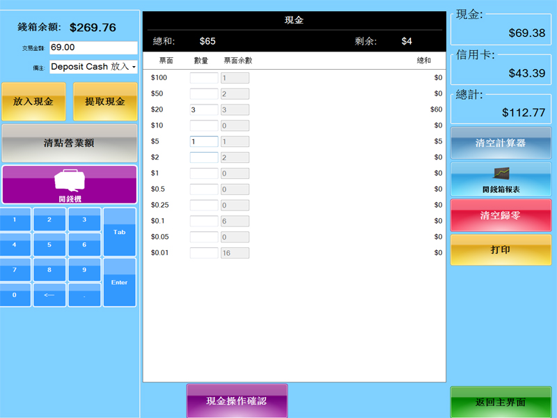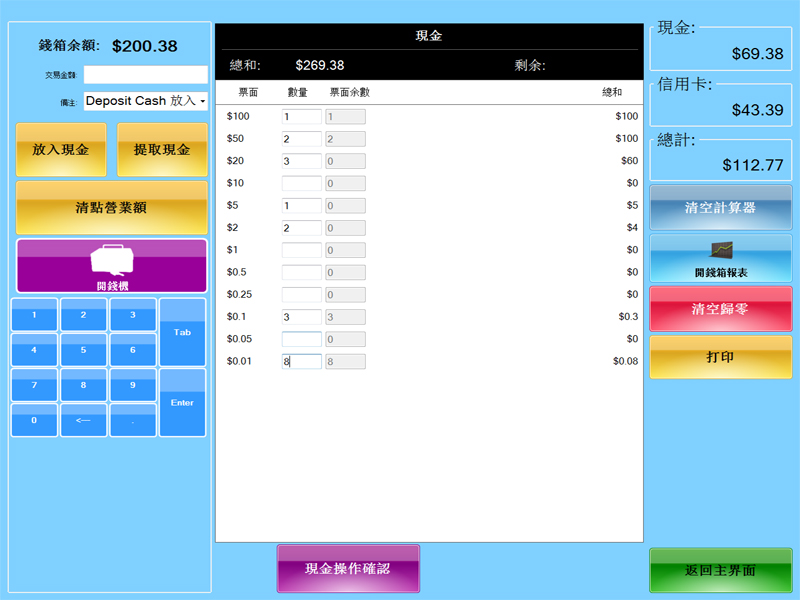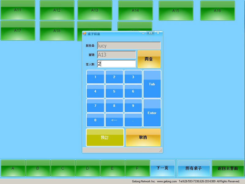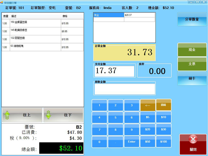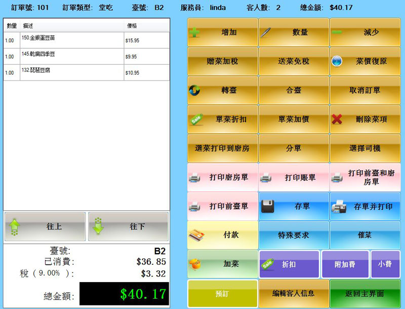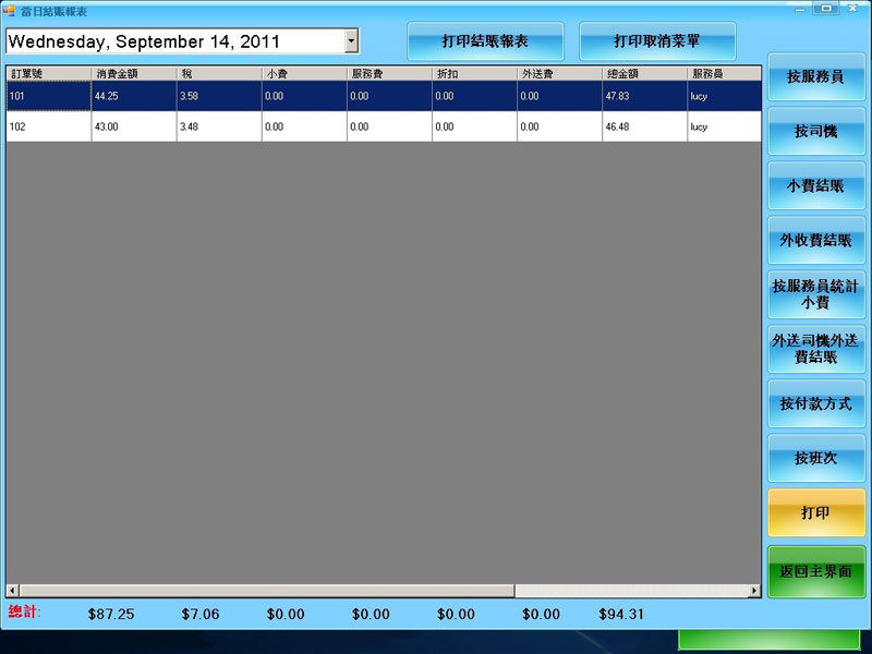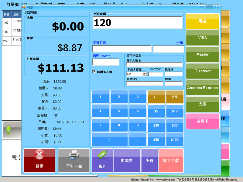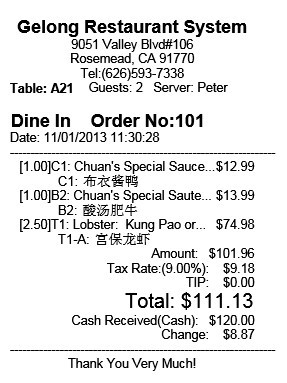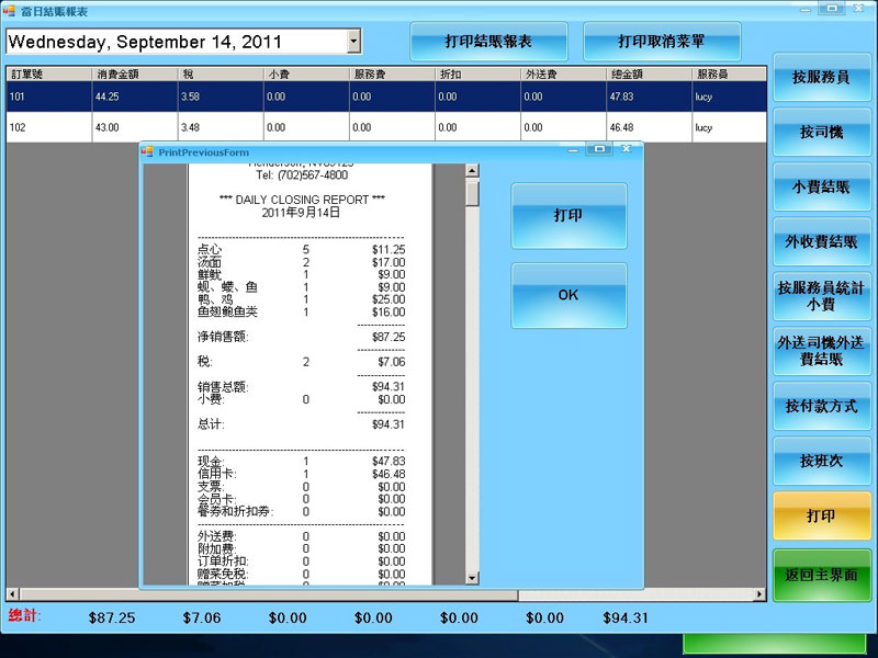 客人用完餐叫買單,先按“打印帳單” 打印一張單子給客人,從單子上知道需要支付多少錢和小費,現金或信用卡回來後,點擊付款.付款必須是Cashier身份.