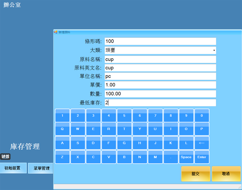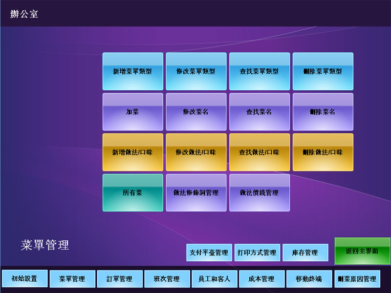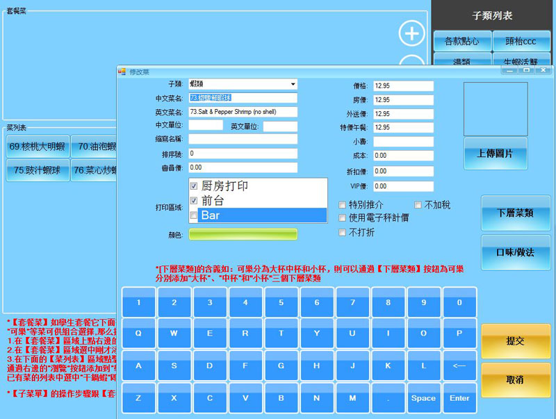 菜名和英文菜名,價格必須輸入,打印方式必須選擇打勾,指定這道菜要打印到那一台打印機. 有些菜,如飲料,有大中小杯,價格不一樣,可以用下層菜單來設定。