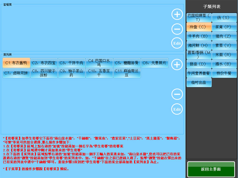 20.按类别修改菜,點擊右邊子類,左下方就是菜,點擊其中一道菜,Edit 是修改,+是新增一道菜,-刪除一道菜.注意上方一格是套餐菜,具體做法見下面說明