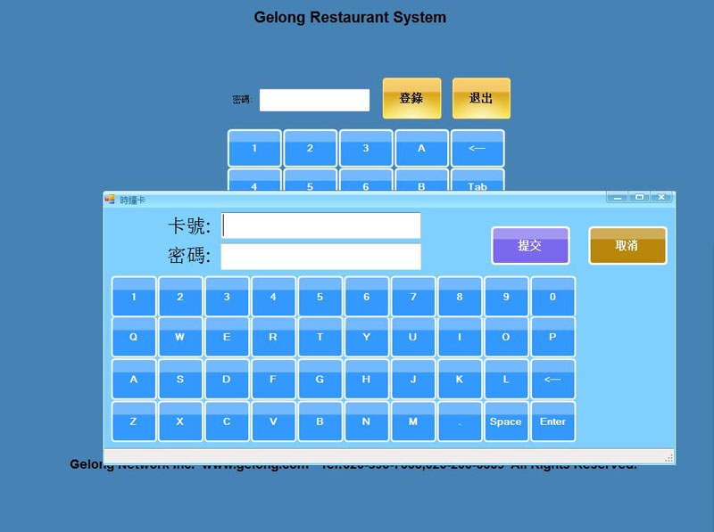 1.登录界面,每個工作人員有不同的密碼,退出系統需要Boss或DM密碼,
