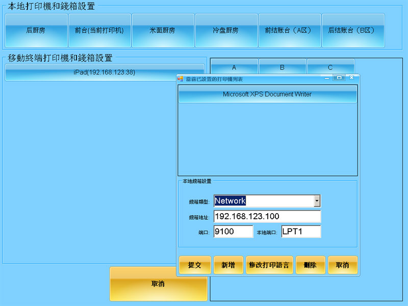 25. 打印机设置,必須為前臺和廚房制定打印機,如果有多臺廚房和區域打印機,也可以指派打印機給它們,讓不同的菜打印到不同區域. 其中前臺打印機需要設置錢箱,