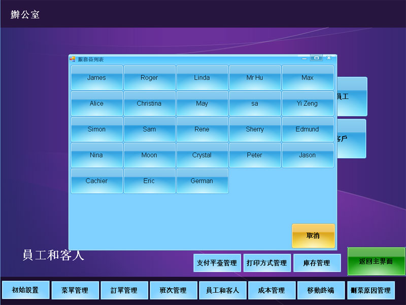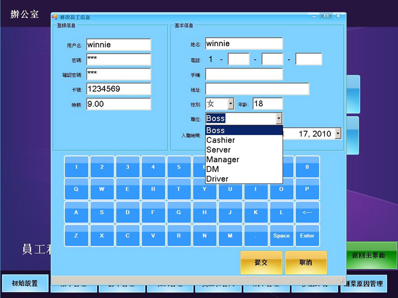 24. 用户名和姓名都要输入,密码整个系统不能重, 职位要注意:BOSS 可以进后台办公室和看报表, Manager 可取消一些没有用的订单