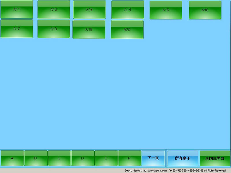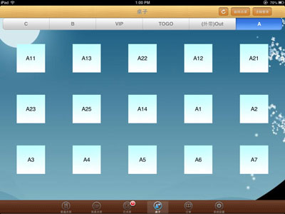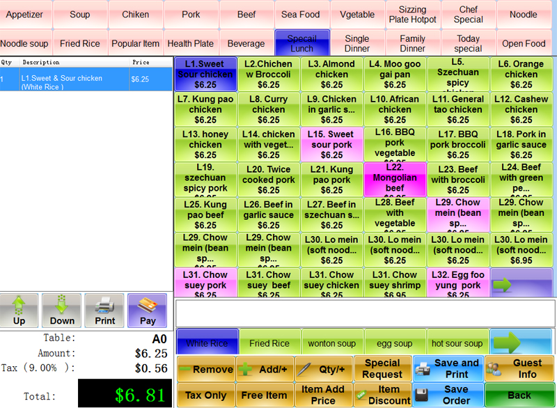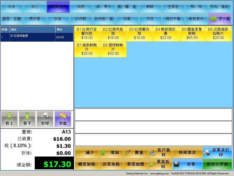 6.分类点菜, 蓝色为类别,黄色为这个类别的菜,點好的菜必須存單,存單後可以稍後送進廚房,如果點存單並打印,會存單同時將單送進廚房打印機.