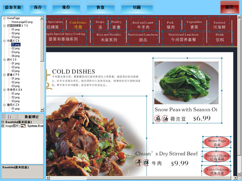 27.電子菜譜的設置,到辦公室-->電子菜譜.添加首頁,畫框關聯相關的類別,添加類別頁面,劃框關連到每一道菜.