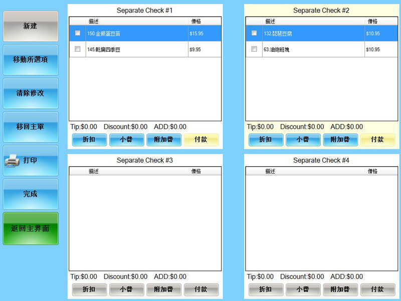 类推分第3个Check #3, 如果多于4个单,请按“新建”加单。分好后点打印,打印出来的多张分单,给客人买单。客人拿回分單後,逐个点付款,, 需要全步分单一次做完付款,当所有分单付完款之后,这张会自动关闭。