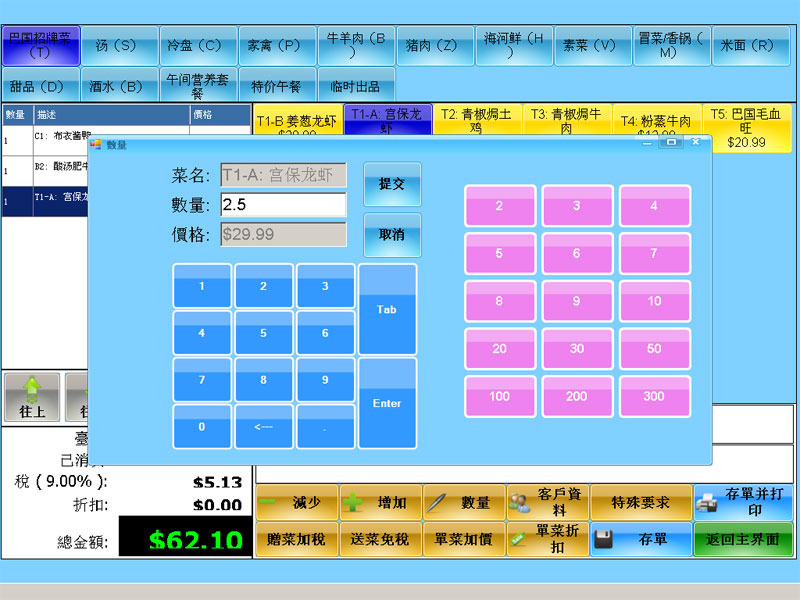 7. 增加数量,數量可以是小數點,如果您的菜按重量計價,可以輸入每LB價格,如果重量為2.5LB,數量可以輸入2.5